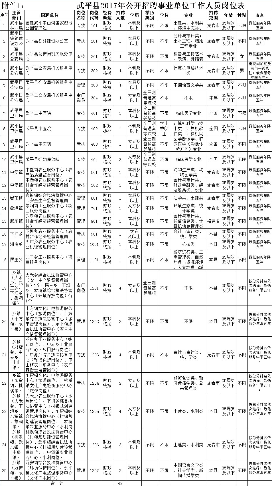 本次公開招聘崗位為武平縣屬事業(yè)單位編制內(nèi)工作人員,計劃招聘人數(shù)42人,具體的招聘崗位、人數(shù)、崗位資格條件等詳見《武平縣2017年公開招聘事業(yè)單位工作人員崗位表》(附件1)。
