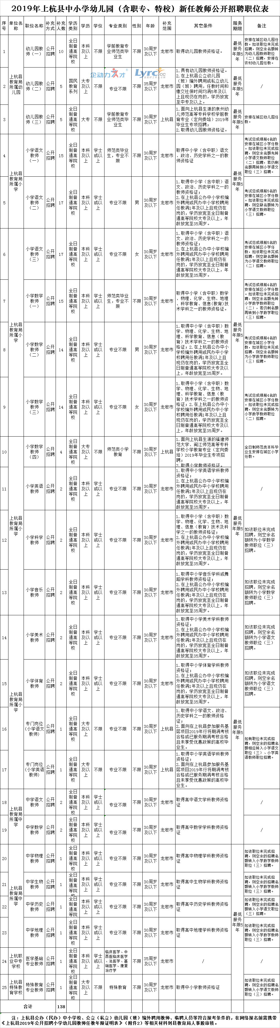 全縣本次公開招聘職位25個(gè),計(jì)劃招聘人數(shù)138人, 其中:幼兒園教師20名,小學(xué)教師108名,中學(xué)教師8名,職業(yè)中專專業(yè)教師1名,特殊教育學(xué)校教師1名,均為事業(yè)單位編制內(nèi)招聘。具體的招聘職位、人數(shù)及任職條件要求等詳見《2019年上杭縣中小學(xué)幼兒園(含職專、特校)新任教師公開招聘職位表》(附件1)。