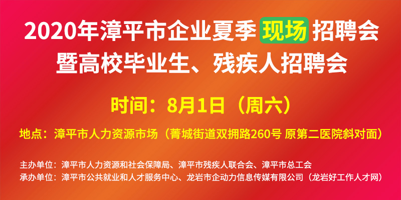 - 【8月1日招聘會(huì)】2020年漳平市企業(yè)夏季現(xiàn)場招聘會(huì)暨高校畢業(yè)生招聘會(huì)、殘疾人招聘會(huì)