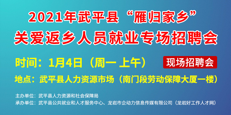 您當(dāng)前的位置:首頁 > 武平國有企事業(yè) > 【1月4日武平招聘會】2021年武平縣“雁歸家鄉(xiāng)”關(guān)愛返鄉(xiāng)人員就業(yè)專場招聘會