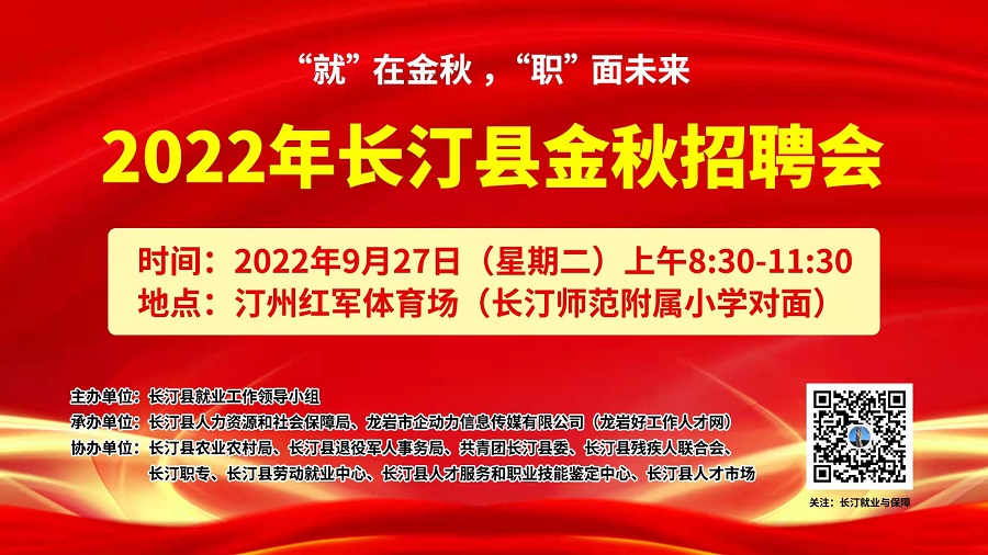 • 【9月27日長汀現(xiàn)場招聘會】2022年長汀縣金秋招聘會