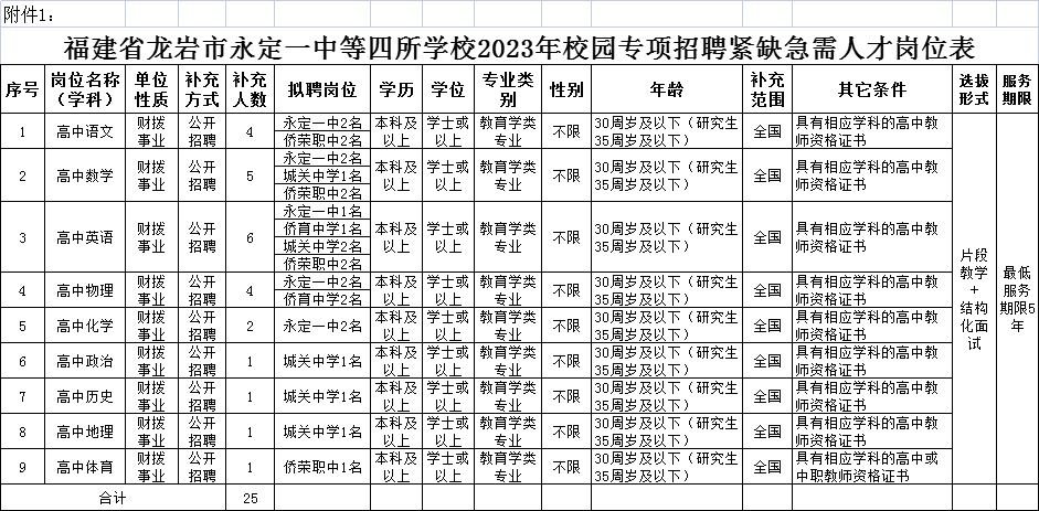 招聘學(xué)校包含永定第一中學(xué)、永定區(qū)城關(guān)中學(xué)、永定區(qū)僑育中學(xué)、永定區(qū)僑榮職業(yè)中專學(xué)校。崗位及人數(shù):高中語文4名、高中數(shù)學(xué)5名、高中英語6名、高中物理4名、高中化學(xué)2名、高中政治1名、高中歷史1名、高中地理1名、高中體育1名,合計25名。具體招聘崗位、人數(shù)及資格條件等詳見《福建省龍巖市永定一中等四所學(xué)校2023年校園專項招聘緊缺急需人才崗位表》(附件1)。