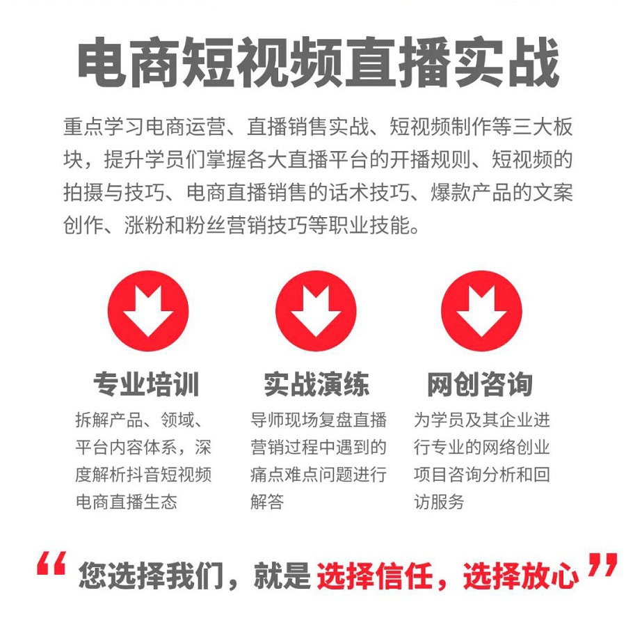 課程內(nèi)容:重點學(xué)習(xí)電商運營、直播銷售實戰(zhàn)、短視頻制作等三大板塊,提升學(xué)員們掌握各大直播平臺的開播規(guī)則、短視頻的拍攝與技巧、電商直播銷售的話術(shù)技巧、爆款產(chǎn)品的文案創(chuàng)作、漲粉和粉絲營銷技巧等職業(yè)技能。