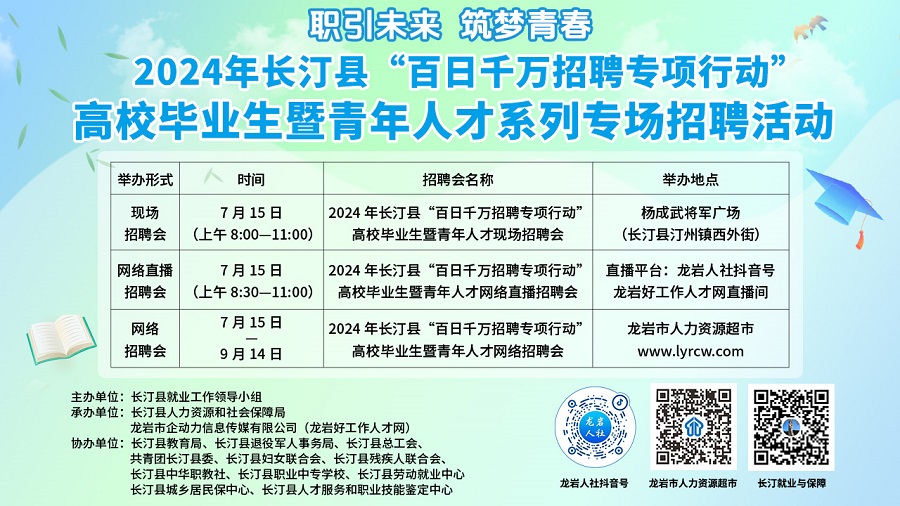 • 2024年長汀縣“百日千萬招聘專項行動”高校畢業(yè)生暨青年人才專場招聘會!職引未來 筑夢青春!