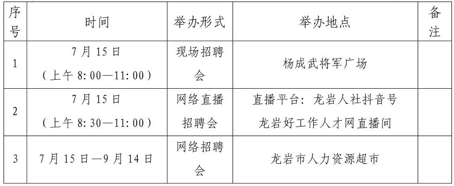 1.用人單位可選擇參加現(xiàn)場招聘會、網(wǎng)絡(luò)直播招聘會或網(wǎng)絡(luò)招聘會,也可三場招聘會都參加,三場招聘會都參加的用人單位需在龍巖市人力資源超市網(wǎng)分別報名。