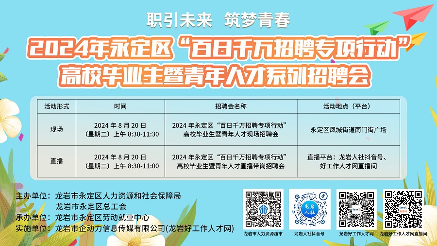 • 【8月20日】2024年永定區(qū)“百日千萬招聘專項(xiàng)行動”高校畢業(yè)生暨青年人才系列招聘會