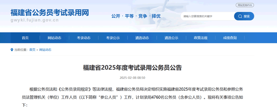 根據(jù)公務員法和《公務員錄用規(guī)定》等法律法規(guī),福建省公務員局決定組織實施福建省2025年度考試錄用公務員和參照公務員法管理機關(單位)工作人員(以下簡稱“參公人員”)工作,計劃錄用4760名公務員(含參公人員),F(xiàn)將有關事項公告如下: