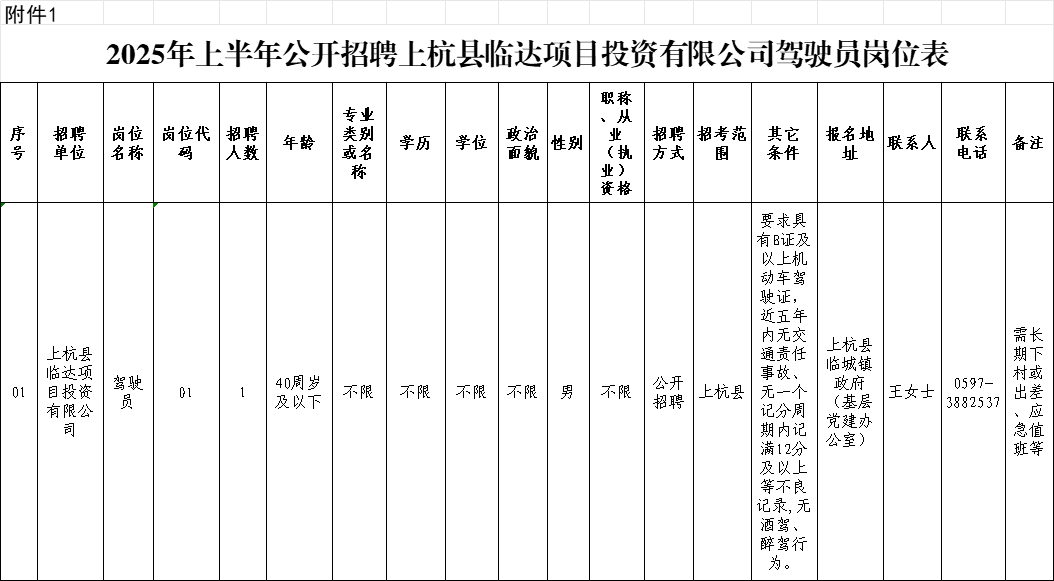 1.2025年上半年公開(kāi)招聘上杭縣臨達(dá)項(xiàng)目投資有限公司駕駛員崗位表