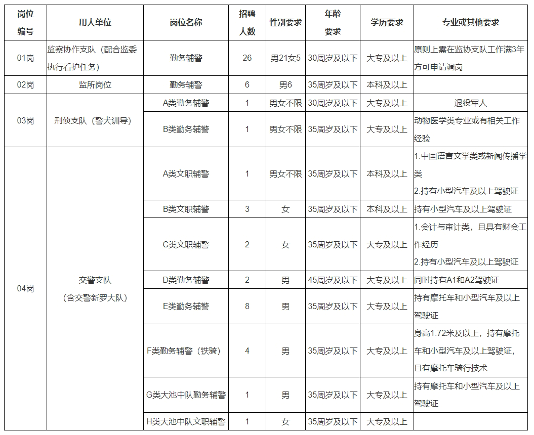 本次計(jì)劃招聘輔警56名,具體招聘崗位及要求詳見招聘崗位表。