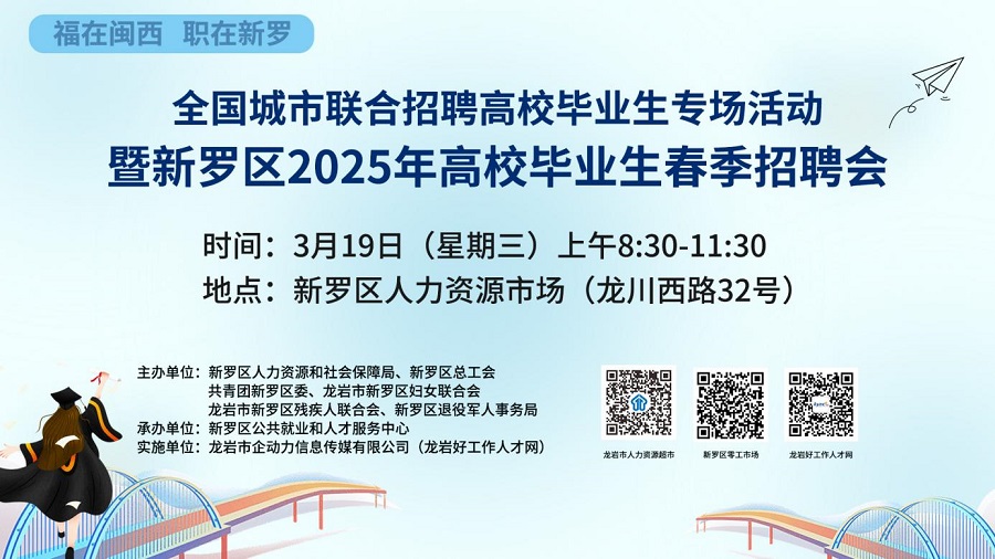 此次招聘會(huì)是由新羅區(qū)人力資源和社會(huì)保障局、新羅區(qū)總工會(huì)、共青團(tuán)新羅區(qū)委、龍巖市新羅區(qū)婦女聯(lián)合會(huì)、龍巖市新羅區(qū)殘疾人聯(lián)合會(huì)、新羅區(qū)退役軍人事務(wù)局主辦;新羅區(qū)公共就業(yè)和人才服務(wù)中心承辦 ;龍巖市企動(dòng)力信息傳媒有限公司(龍巖好工作人才網(wǎng))實(shí)施,以“福在閩西 職在新羅”為主題。