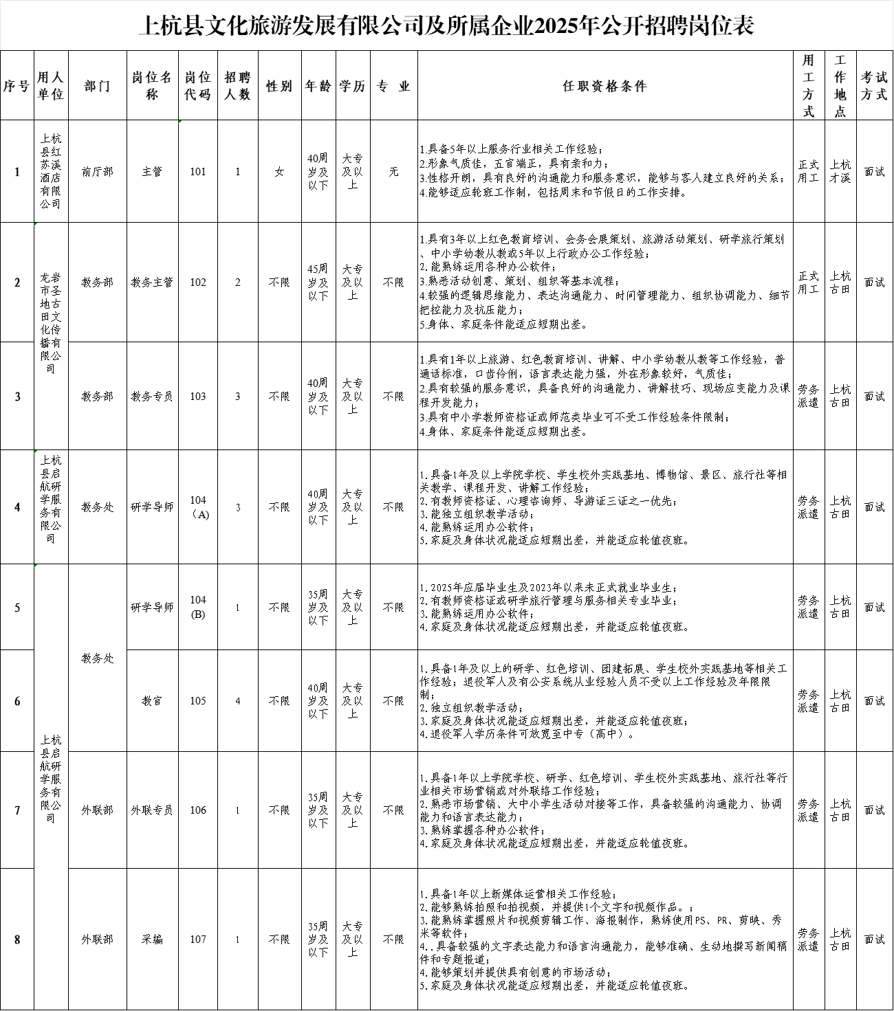 上杭縣文化旅游發(fā)展有限公司(上杭古田建設(shè)發(fā)展公司)系龍巖市杭川實(shí)業(yè)集團(tuán)有限公司下屬國(guó)有獨(dú)資企業(yè),F(xiàn)因業(yè)務(wù)拓展需要,決定面向社會(huì)公開招聘所屬企業(yè)部分崗位工作人員,F(xiàn)將有關(guān)招聘事項(xiàng)公告如下: