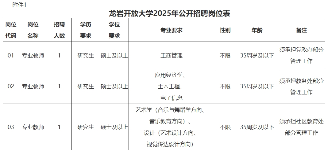 附件:1.龍巖開放大學2025年公開招聘崗位表
