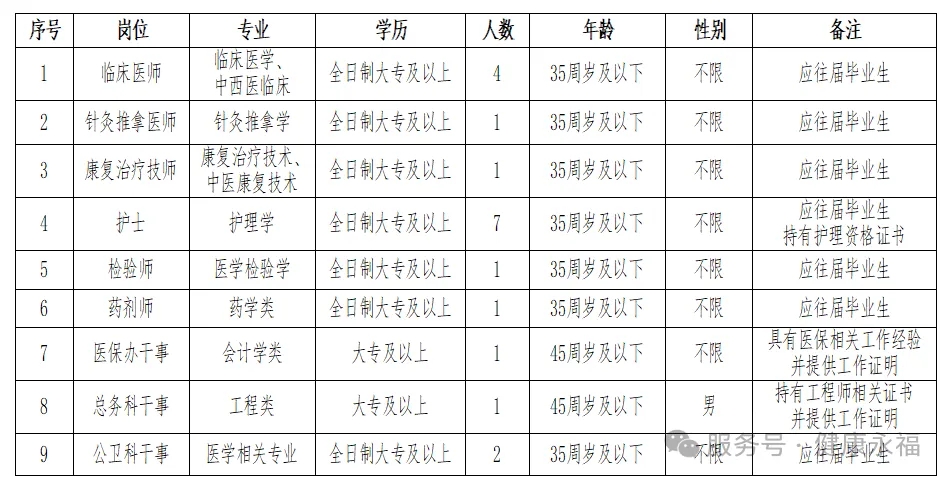 漳平市永福中心衛(wèi)生院招聘編外人員崗位及要求