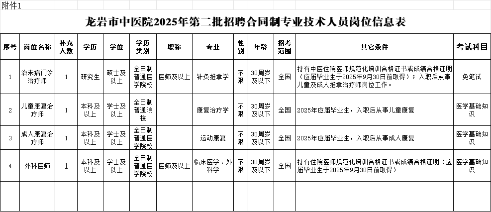 詳見(jiàn)附件1《龍巖市中醫(yī)院2025年第二批招聘合同制專業(yè)技術(shù)人員崗位信息表》。