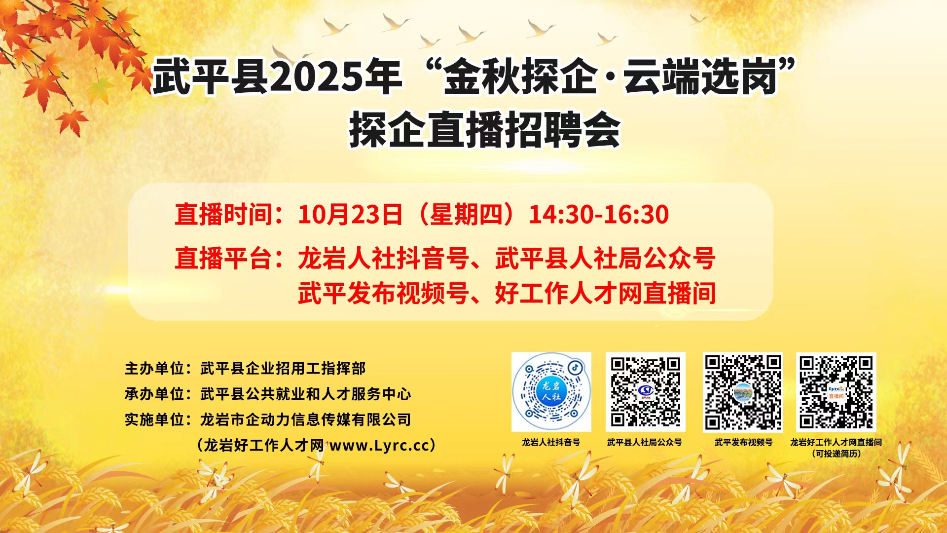 舉辦地點: 龍巖人社抖音號、武平縣人社局公眾號、武平發(fā)布視頻號、好工作人才網(wǎng)直播間