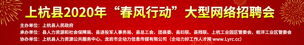 舉辦單位:上杭縣人民政府 承辦單位:縣人力資源和社會保障局、縣退役軍人事務(wù)局、縣總工會、團(tuán)縣委、縣婦聯(lián)、縣殘聯(lián)、上杭工業(yè)園區(qū)管委會、蛟洋工業(yè)區(qū)管委會 協(xié)辦單位:上杭縣人力資源公共服務(wù)中心、龍巖市企動力信息傳媒有限公司(企動力好工作人才網(wǎng) www.onlinepeopleservices.com)
