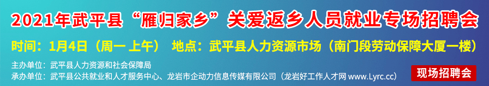 舉辦單位:武平縣人力資源和社會(huì)保障局 承辦單位:武平縣公共就業(yè)和人才服務(wù)中心、龍巖市企動(dòng)力信息傳媒有限公司(龍巖好工作人才網(wǎng))