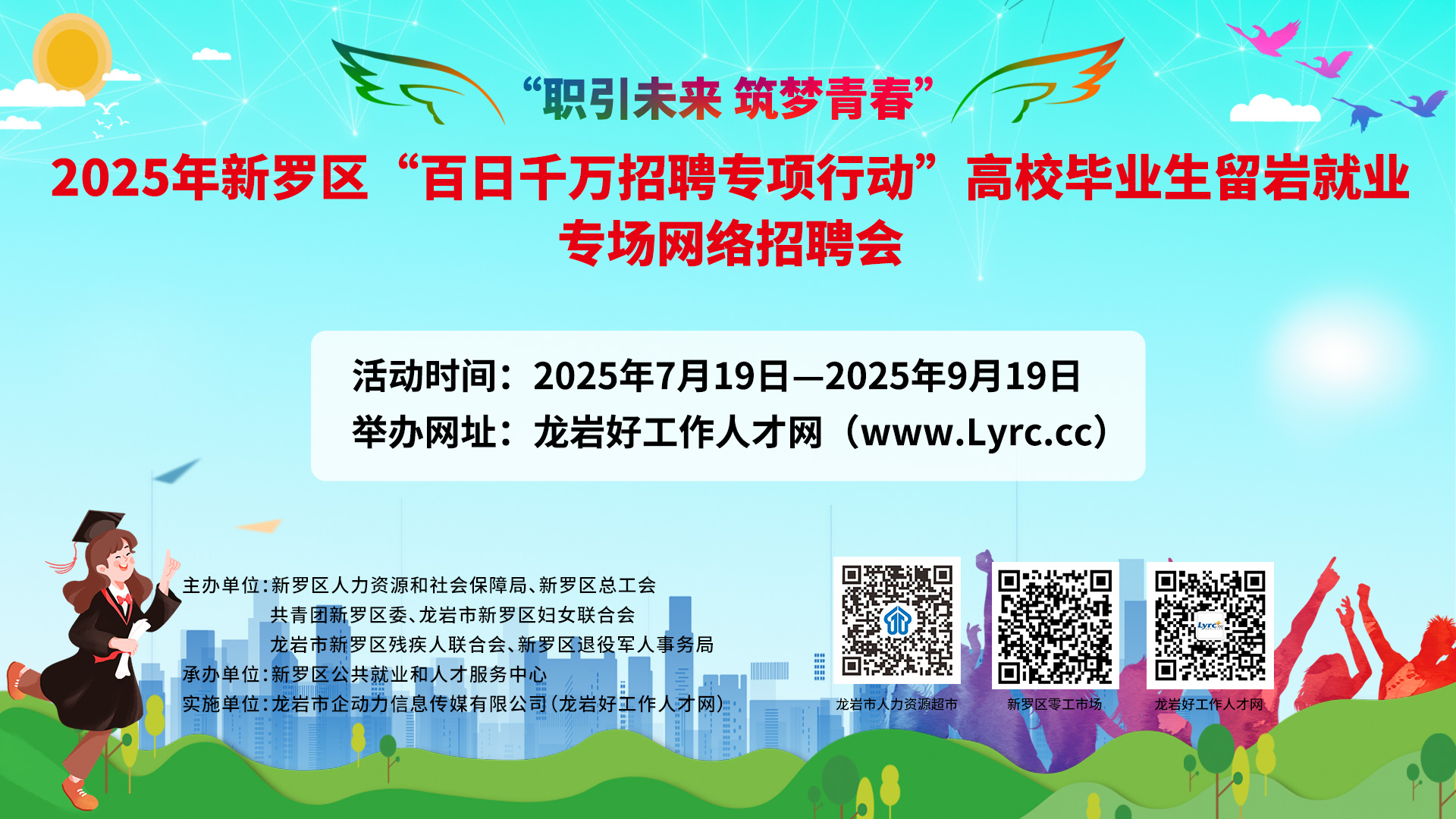 舉辦單位:新羅區(qū)人力資源和社會保障局 新羅區(qū)總工會 共青團(tuán)新羅區(qū)委 龍巖市新羅區(qū)婦女聯(lián)合會 龍巖市新羅區(qū)殘疾人聯(lián)合會 新羅區(qū)退役軍人事務(wù)局