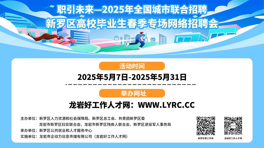 舉辦單位:新羅區(qū)人力資源和社會(huì)保障局 新羅區(qū)總工會(huì) 共青團(tuán)新羅區(qū)委 龍巖市新羅區(qū)婦女聯(lián)合會(huì) 龍巖市新羅區(qū)殘疾人聯(lián)合會(huì) 新羅區(qū)退役軍人事務(wù)局