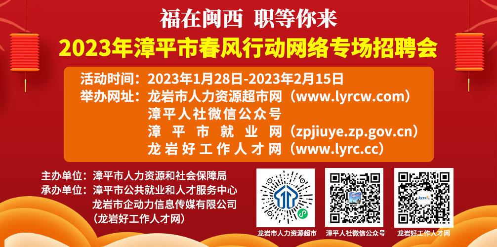 舉辦地點:龍巖市人力資源超市網(wǎng)、漳平人社微信公眾號、漳平市就業(yè)網(wǎng)、龍巖好工作人才網(wǎng)