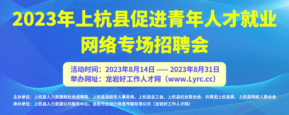 舉辦單位:上杭縣人力資源和社會保障局、上杭縣退役軍人事務(wù)局、上杭縣總工會、上杭縣婦女聯(lián)合會、共青團上杭縣委、上杭縣殘疾人聯(lián)合會