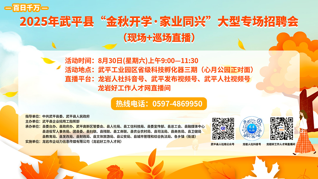 舉辦地點:直播地點:龍巖市人力資源超市(閩西交易城A6幢三層) 直播平臺:“龍巖人社”抖音號