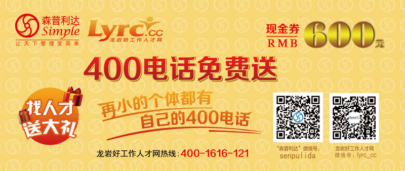 400電話--企業(yè)實(shí)力的象征!400電話,也稱為400全國統(tǒng)一熱線或400企業(yè)商用電話,是在中國通訊業(yè)興起的企業(yè)營銷新服務(wù)。400電話是企業(yè)終身不變的電話號(hào)碼,更是企業(yè)品牌的象征,確保不錯(cuò)過任何商機(jī),優(yōu)先于同行企業(yè),是企業(yè)信息化的前站!即日起龍巖好工作人才網(wǎng)特別推出400電話免費(fèi)贈(zèng)送活動(dòng)!(內(nèi)含600元話費(fèi);首年彩鈴功能費(fèi)(價(jià)值120元);彩鈴功能上傳費(fèi)(價(jià)值30元))數(shù)量有限送完即止!