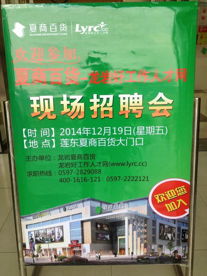 歡迎參加12月19日夏商百貨-龍巖好工作人才網(wǎng)現(xiàn)場(chǎng)招聘會(huì)