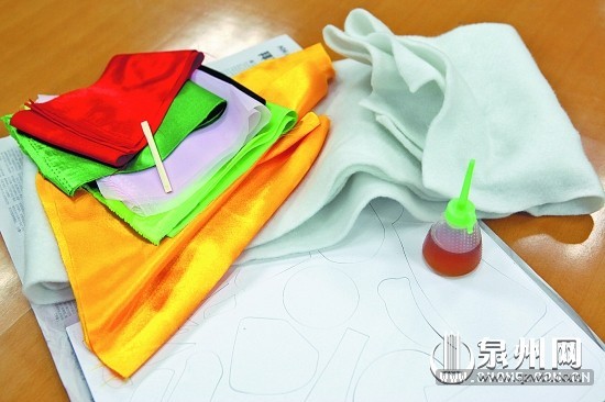 第一個(gè)步驟,按照紙板上的模型,剪好棉絮和對(duì)應(yīng)顏色的綢布,再用膠水在紙板上將棉絮黏好,防止包布時(shí)移動(dòng)。