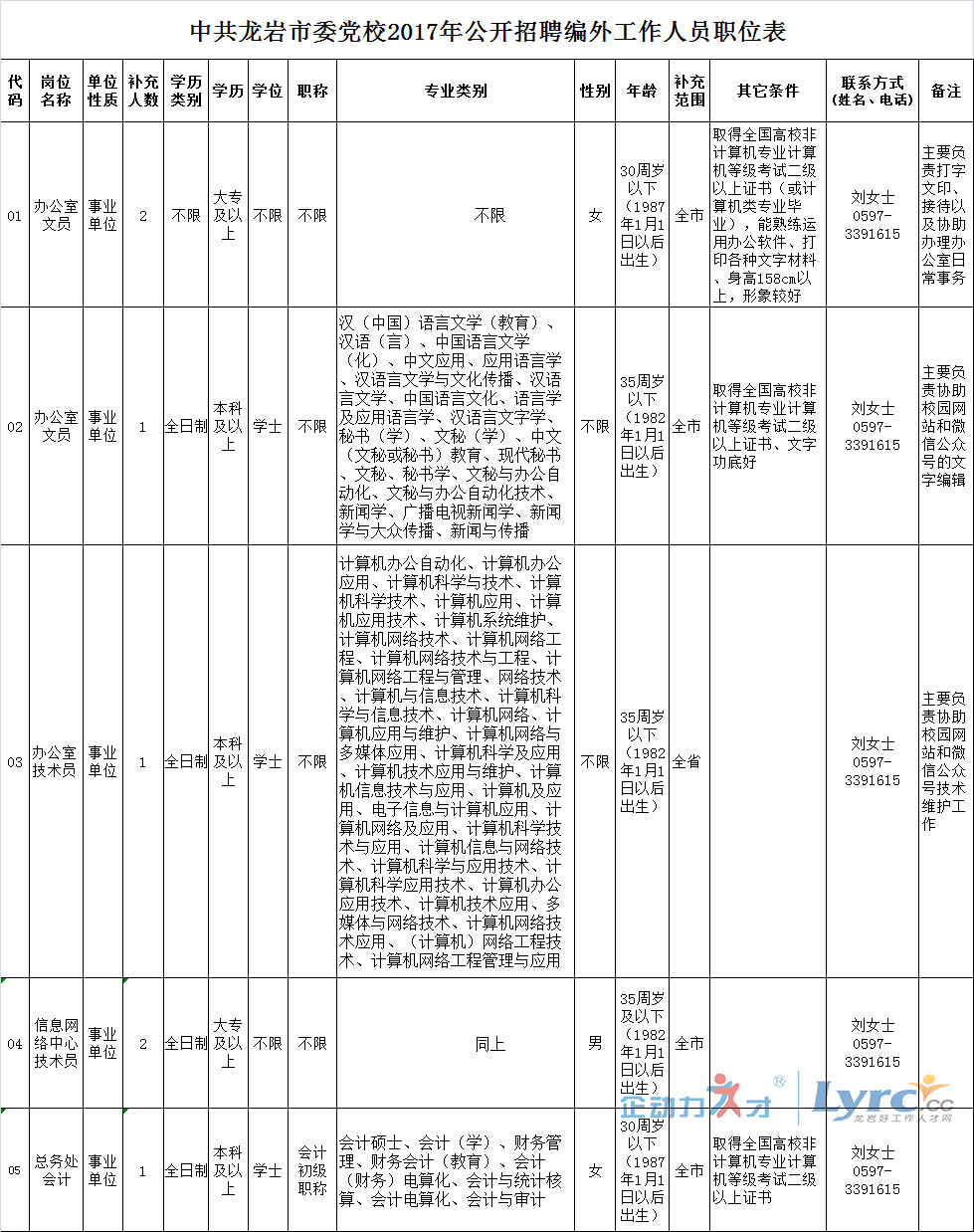 詳見《中共龍巖市委黨校2017年招聘編外工作人員職位表》(附件1)。
