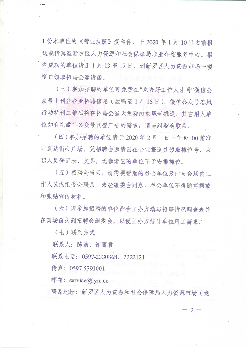 (二)參加招聘的單位需填寫好《2020年 “龍巖市人力資源超市—春風(fēng)行動(dòng)”大型人力資源現(xiàn)場(chǎng)招聘會(huì)報(bào)名表》,同時(shí)準(zhǔn)備好1份本單位的《營業(yè)執(zhí)照》復(fù)印件,于2020年1月10日之前報(bào)送或傳真至新羅區(qū)人力資源和社會(huì)保障局職業(yè)介紹服務(wù)中心。報(bào)名成功的單位請(qǐng)于1月13至17日,到新羅區(qū)人力資源市場(chǎng)一樓窗口領(lǐng)取招聘會(huì)邀請(qǐng)函。