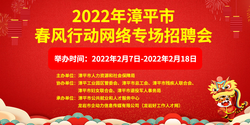 為深入學(xué)習(xí)貫徹黨的十九屆四中、五中、六中全會精神,做好春節(jié)期間漳平市就業(yè)創(chuàng)業(yè)工作,搭建企業(yè)與求職者雙向?qū)悠脚_,漳平市人力資源和社會保障局擬舉辦“2022年漳平市春風(fēng)行動網(wǎng)絡(luò)專場招聘會”,具體方案如下:
