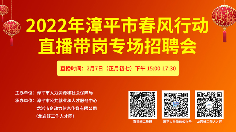 【正月初七直播】歡迎參加2022年漳平市春風(fēng)行動(dòng)直播帶崗專場(chǎng)招聘會(huì)