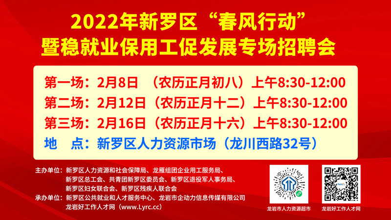 為進一步做好新形勢下就業(yè)創(chuàng)業(yè)工作,新羅區(qū)重點企業(yè)深入實施就業(yè)優(yōu)先發(fā)展戰(zhàn)略,建立企業(yè)與高校畢業(yè)生、勞動者對接交流服務平臺和聯(lián)系渠道,促進城鄉(xiāng)勞動者合理有序流動,幫助企業(yè)緩解用工和人才緊缺矛盾,擬在2022年春節(jié)期間舉辦三場專場招聘會。