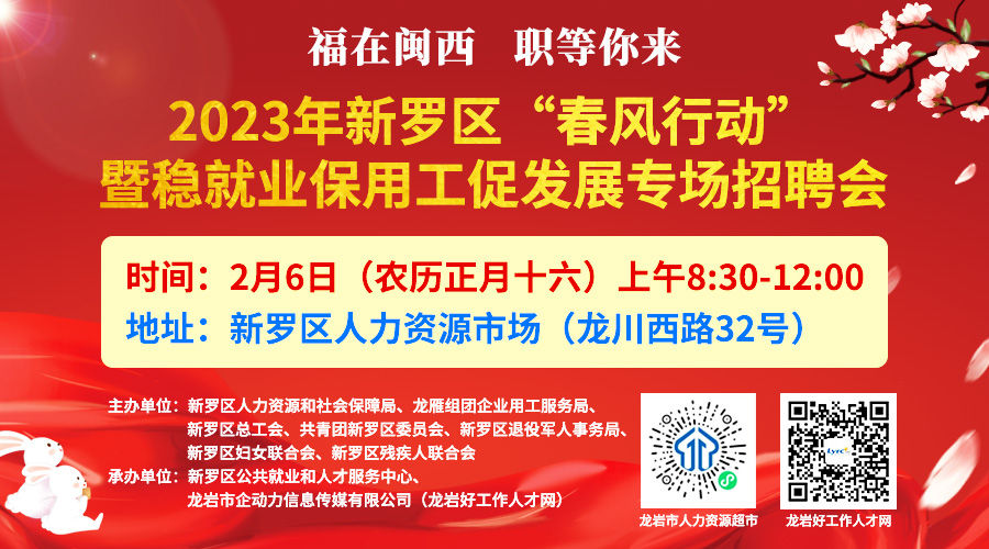 第一場:2023年新羅區(qū)“春風(fēng)行動”暨穩(wěn)就業(yè)保用工促發(fā)展專場招聘會(農(nóng)歷正月十二場次)