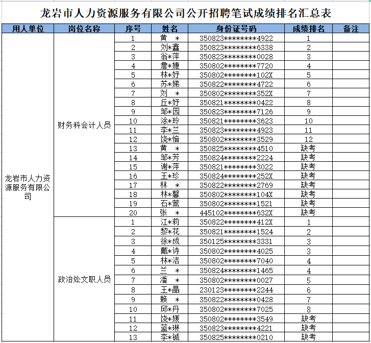 根據(jù)2022年12月9日發(fā)布的《龍巖市人力資源服務(wù)有限公司公開招聘派遣員工公告》、2022年12月21日發(fā)布的《龍巖市人力資源服務(wù)有限公司公開招聘派遣員工調(diào)整資格條件延期報名的補充公告》有關(guān)要求,現(xiàn)將派遣至龍巖監(jiān)獄財務(wù)科會計及政治處文員崗位筆試成績排名予以公示。