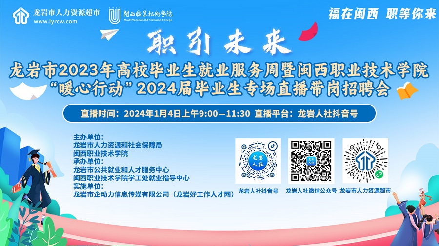 為深入貫徹黨中央國(guó)務(wù)院關(guān)于促進(jìn)高校畢業(yè)生就業(yè)工作決策部署,進(jìn)一步做好面向我市高校畢業(yè)生的就業(yè)服務(wù)工作,結(jié)合人社部2023年公共就業(yè)服務(wù)專(zhuān)項(xiàng)活動(dòng)安排,龍巖市人力資源和社會(huì)保障局、閩西職業(yè)技術(shù)學(xué)院定于2024年1月4日上午舉辦職引未來(lái)——龍巖市2023年高校畢業(yè)生就業(yè)服務(wù)周暨閩西職業(yè)技術(shù)學(xué)院“暖心行動(dòng)”2024屆畢業(yè)生專(zhuān)場(chǎng)直播帶崗招聘會(huì)。